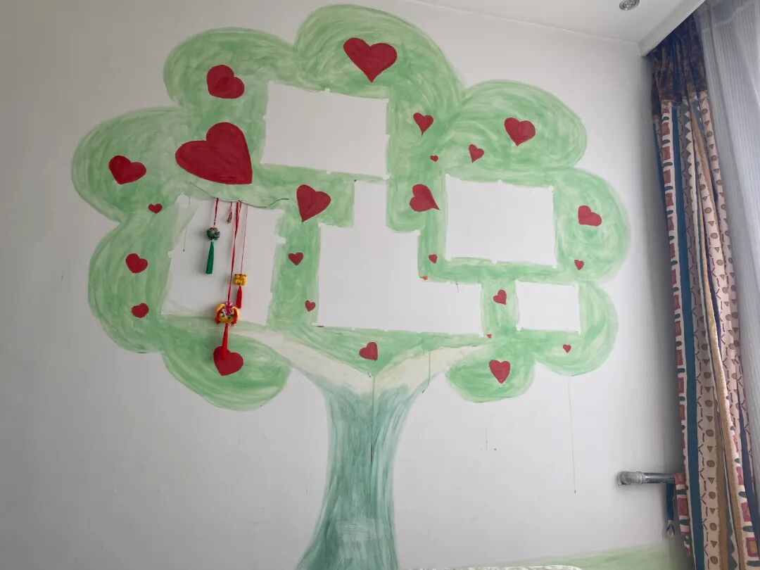 她曾用画画来疗愈自己。老家一间屋子的两面墙都被她用大片的水彩作了画,不规则的颜料甚至蔓延到了天花板上。庆阳农村种苹果树的人家多,丰收季节漫山红色的果实成为了李奕奕的灵感来源,她和父亲说,要画两棵很正、很直、很高大的苹果树,代表“正义之道”。画到一半的时候,她总觉得树还不够直,想要重新抹掉来过,被李思君劝阻住了。