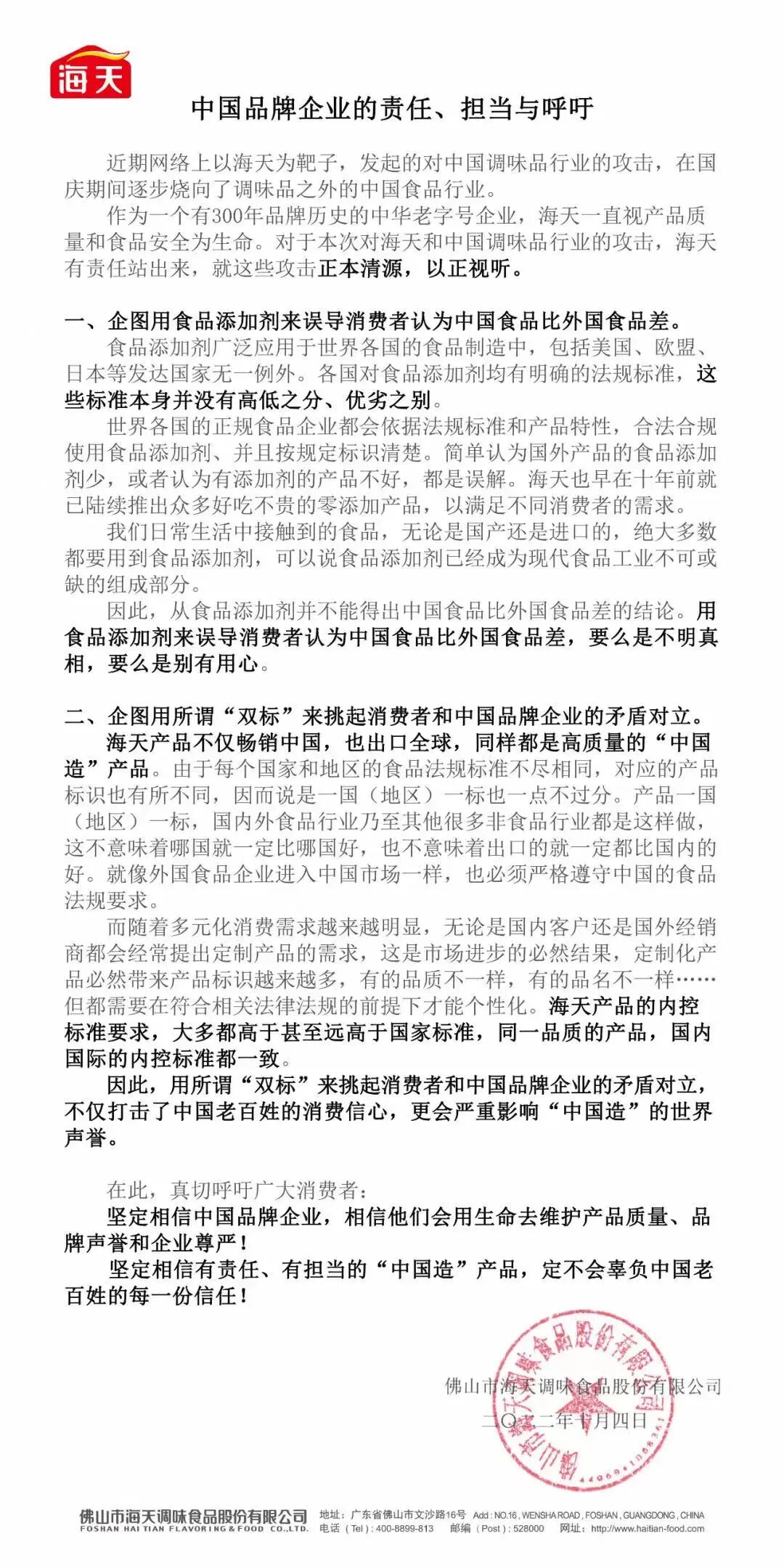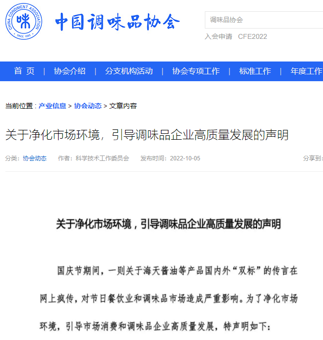 10月5日,中国调味品协会也发布声明称,因各国的饮食和消费习惯不同,同一类产品的标准要求会有所不同。但是,标准本身并不存在高低之分。支持因舆情受到影响的调味品企业依法维权,追究网络造谣者的法律责任。