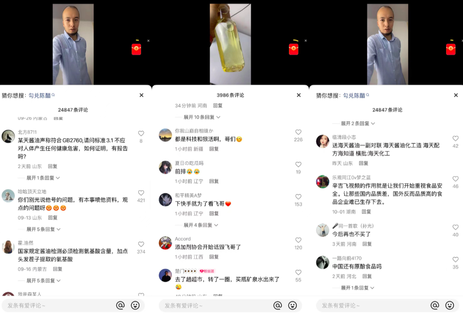 随着辛吉飞的持续爆料,越来越多的食品制作原料被观众所熟知,其中不乏一些人们耳熟能详的大牌。9月10日,辛吉飞发布了一个制作勾兑酱油的方法,虽然没指名道姓,但观众还是联想到了“酱油一哥”海天味业。