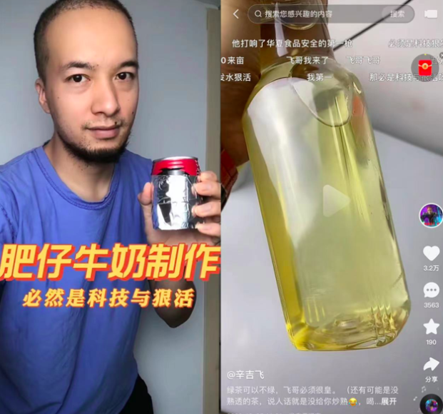 面对来自企业方面的压力,辛吉飞不仅没有停下揭秘的脚步,反之将实验目标转向了更多知名的大牌食品。视频中,辛吉飞并没有直接点名,而称之为“肥仔牛奶、某叶绿茶”。