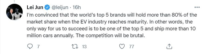 “换句话说,我们成功的唯一途径是成为前五名之一,并且每年出货超过1000万辆。竞争将是残酷的。”