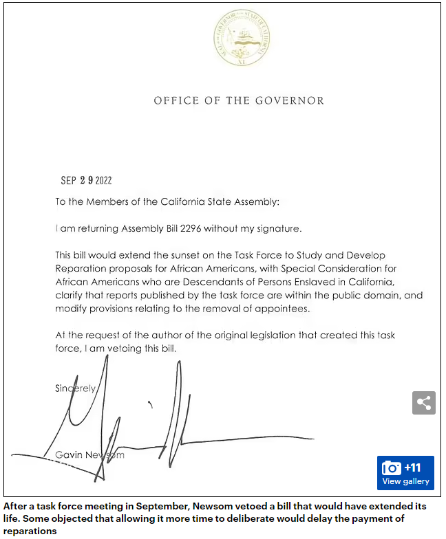 在 9 月份举行的特别赔偿委员会会议后,加州州长纽森否决了将赔偿案延期讨论的法案。