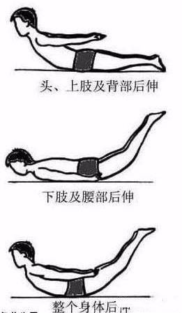 俯卧在床上,两手十指交叉放于背后,全身上下自然放松,缓慢吸气的同时头慢慢向上翘起,逐渐到颈椎、胸椎、腰椎、骶尾椎直至下肢部,屏气5-10秒钟,然后缓慢呼气。