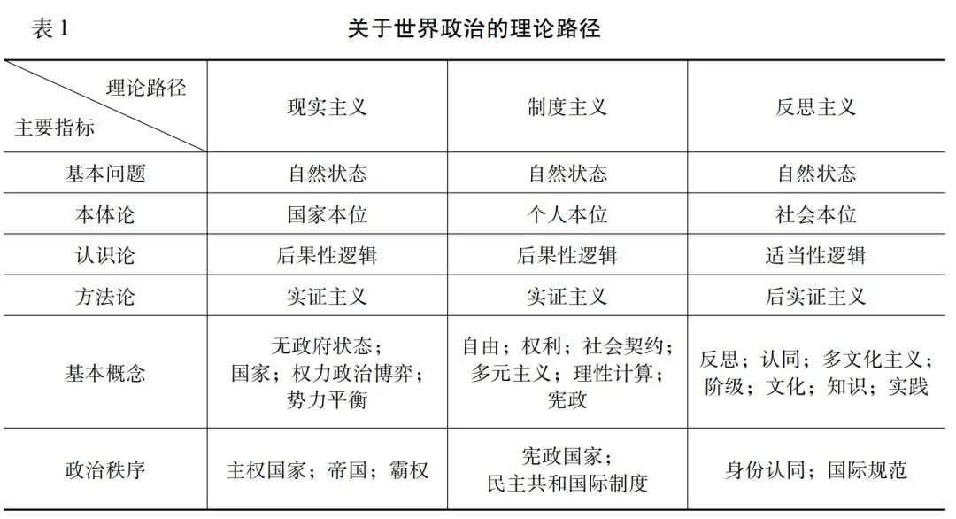 与现实主义和规范主义相比,以批判理论、后现代主义、女性主义、建构主义为代表的“反思主义理论”(Reflexive Theories)则强调观念、认同、话语和社会实践等社会性因素对世界政治的影响,强调共享观念、知识、认同、建构等因素对世界政治的意义,触及影响世界政治的复杂社会文化因素,对一些非国家行为体在世界政治中的参与行为具有一定的解释力,是一种以社会为本位、基于适当性逻辑的社会理论。然而,反思主义理论并没有建立起成熟的理论框架,更多停留在规范分析层面,在解释“为什么世界政治秩序是如何可能的”方面还没有什么建树。此外,一些左翼的思想家固守阶级中心论,强调“世界体系”论、“文化帝国主义”论等,将世界政治为转化为世界经济问题和文化问题。这尽管对深化理解世界政治有所帮助,但也无法回答“世界政治秩序是如何可能的”这一根本理论问题。
