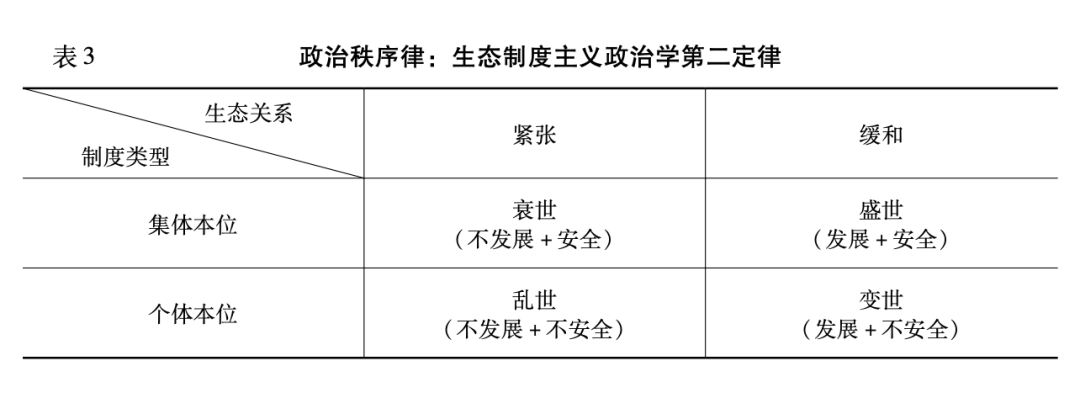 另外,生态系统与制度类型的不同组合,左右着政治秩序的不同形态。在集体本位的制度框架下,发展的指令是自上而下运行的。人地关系处于紧张情况下的社会,往往更有利于社会集中权力,导致发展不活跃与安全并存的衰世局面;而人地关系处于缓和情况下的社会,往往有利于下放权力,调动起经济和社会的积极性,导致既发展又安全的盛世局面。在个体本位的制度框架下,在人地关系处于紧张情况下的社会,很容易出现人地关系紧张导致的权力集中与个体本位制度导致的权力弥散之间的抗衡,往往表现为不发展也不安全的乱世;而人地关系处于缓和情况下的社会,则呈现为快速发展却不安全的变世。以中国为例,在历史上的不同时期内,中国存在着统一与分裂的分分合合,若将统一时期界定为集体本位的国家制度,而将分裂时期界定为个体本位的国家制度,在汉朝、唐朝、宋朝、明朝、清朝等国家统一时期,风调雨顺、人口稠密的湖广地区、江浙地区和四川盆地往往呈现为盛世秩序,地广人稀、天灾频频的西北地区不断出现流民和灾民的衰世局面,但在强大的集体本位制度压力下,保持了国家统一的稳定局面。在三国、南北朝、五代十国晚期以后的国家分裂时期,不仅东南沿海人地关系缓和地区呈现出衰世迹象,而且在内陆地区更是呈现出军阀混战、盗匪横行的乱世格局。类似的情况在印度、波斯、阿拉伯和欧洲地区也不同程度存在。2020年以来,当今世界呈现乱变交织的复杂局势,从根本上是新冠肺炎疫情冲击下国家主义回归带来的个体本位制度和人地关系复杂变化共同作用的产物。
