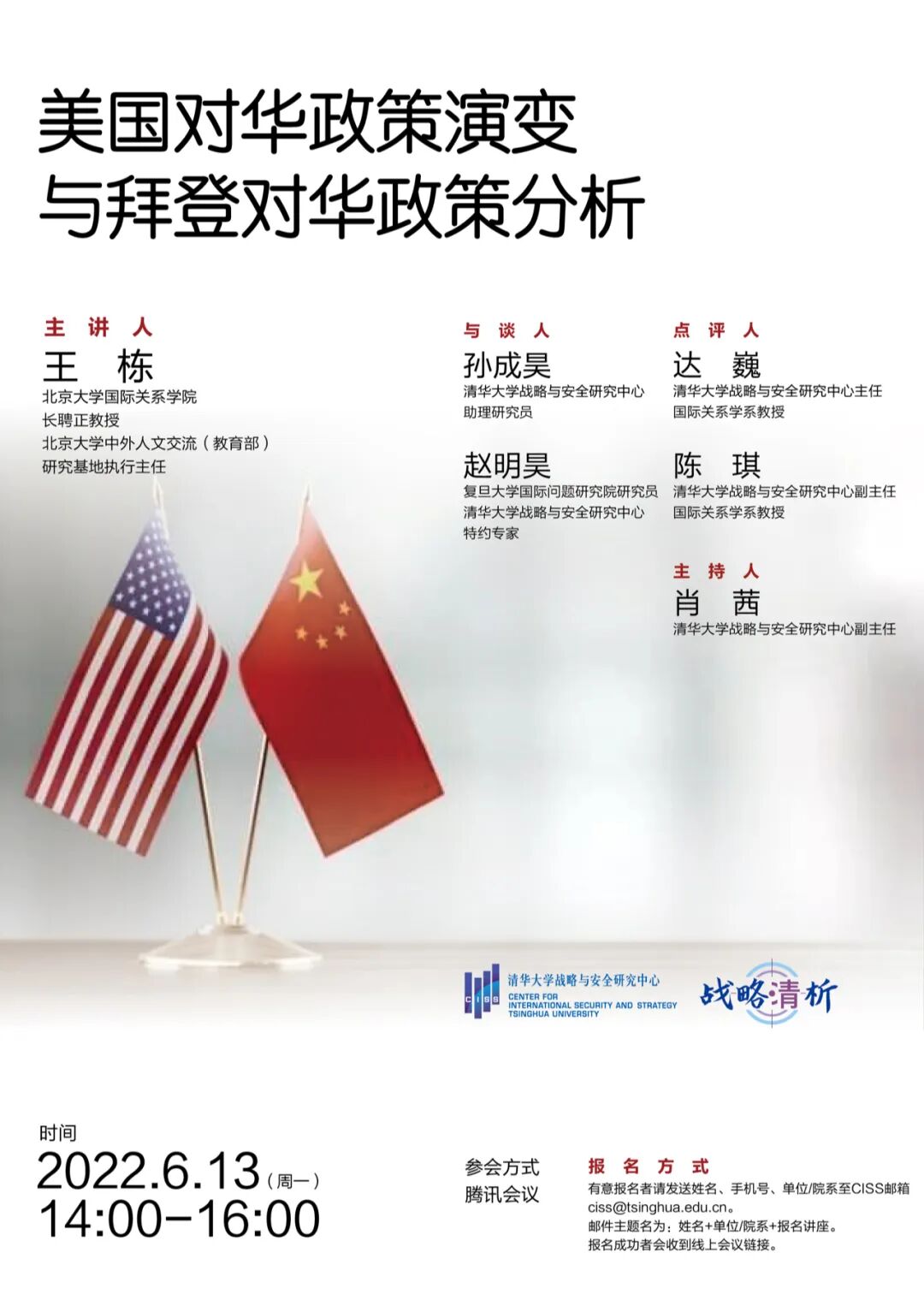 6月13日下午,清华大学战略与安全研究中心(CISS)于线上成功举办第四期战略清析论坛,参会听众近500人。本期战略清析论坛主题为“美国对华政策演变与拜登对华政策分析”,由北京大学国际关系学院长聘教授、北京大学中外人文交流研究基地执行主任王栋主讲,同时邀请清华大学战略与安全研究中心助理研究员孙成昊和复旦大学国际问题研究院研究员、清华大学战略与安全研究中心特约专家赵明昊作为与谈人,就中美关系变化以及美国对华政策走向进行了分享交流。CISS主任、清华大学国际关系学系教授达巍,以及CISS副主任、清华大学国际关系学系教授陈琪担任本次论坛点评人。CISS副主任肖茜主持本次论坛。