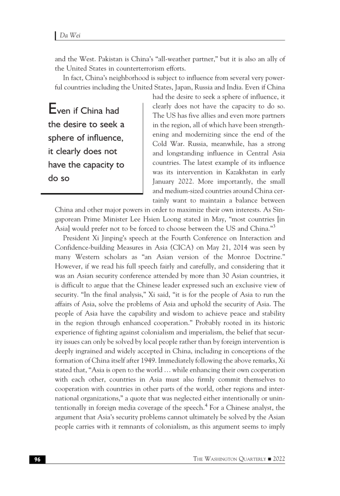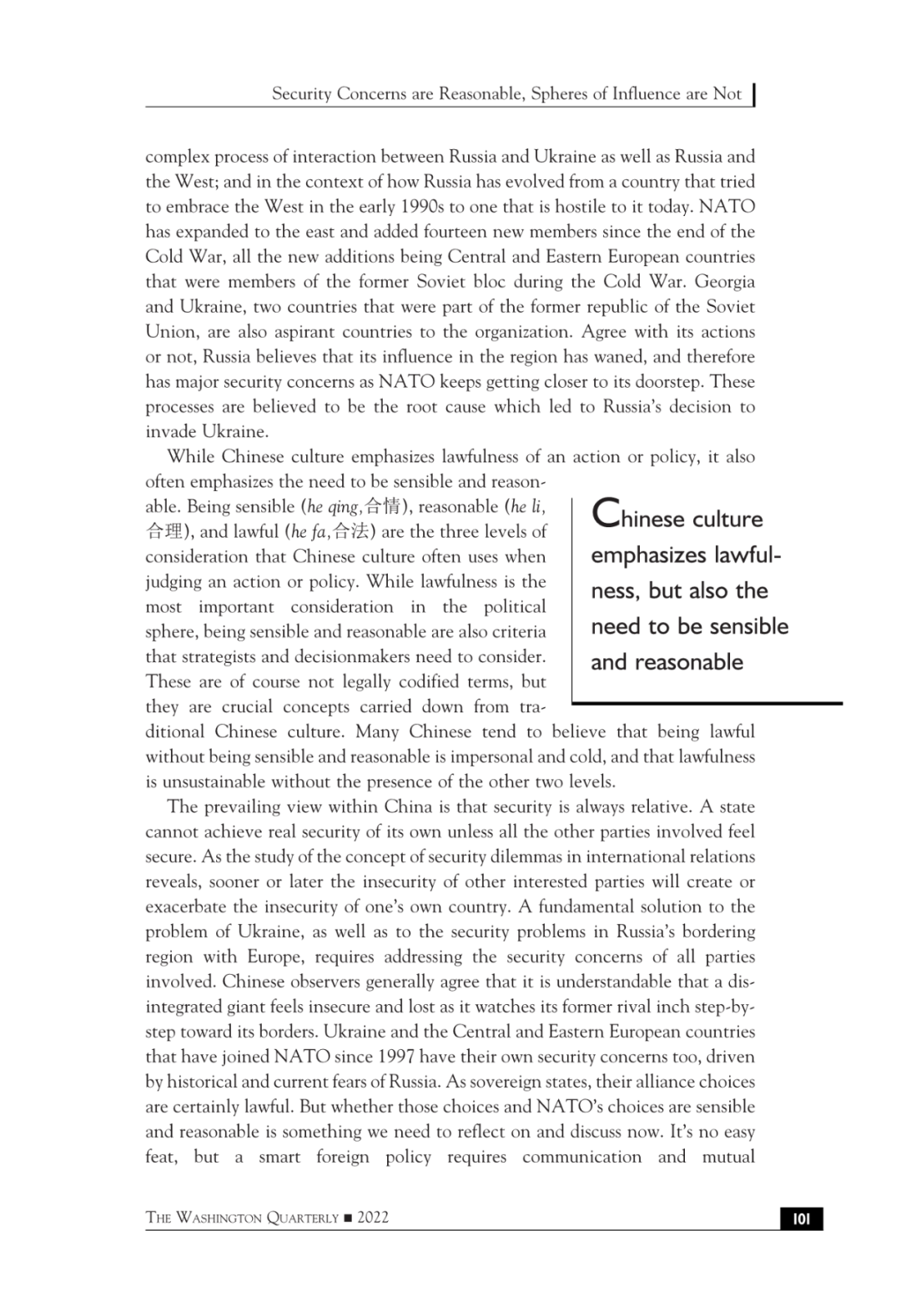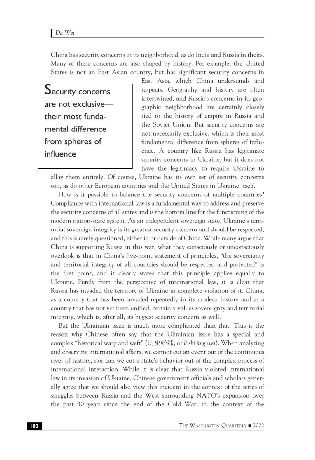7月14日,由清华大学国际关系学系教授、战略与安全研究中心主任达巍撰写的文章“Security Concerns are Reasonable, Spheres of Influence are Not”在《华盛顿季刊(the Washington Quarterly)》第45卷上登载。就近期俄乌冲突引发的关于“势力范围”的争论,达巍在文中详细阐述了“势力范围”和“安全关切”的概念和不同。他指出,中国政府和学术界都反对大国寻求排他性的“势力范围”,但是认为各国也都有其合理的安全关切值得尊重。在处理国际事务时,合法、合理与合情都是需要考虑的问题。国家的行为需要符合国际法,这是国际关系的基本准则。与此同时,只强调合法也是不够的。在国家交往的过程中,各国需要展现出自我约束与彼此照顾的智慧,这也反过来有利于最大限度地实现国际关系当中的合法问题。