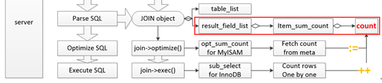 共性:共性存在于 SQL 层,即 SQL 解析之后的数据结构是一致的,count 变量都是存在于作为结果列的 Item_sum_count 类型对象中;返回给客户端的过程也类似 – 对该 count 变量进行赋值并经由 MySQL 通信协议返回给客户端。