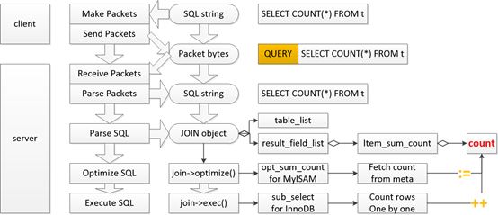 COUNT( * )前置流程: 从 Client 端发 SQL 语句,到 MySQL-Server端执行 SELECT 之前,为后面的一些阐述做一铺垫。