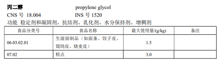 丙二醇广泛应用于食品、医药和化妆品工业中。在食品行业,丙二醇作为一种优良溶剂可将防腐剂、色素、抗氧化剂等难溶于水的食品添加剂溶解于其中;丙二醇也可被用作保湿剂、调料品、调味品和食品着色剂的溶剂;水果运输过程中使用丙二醇催熟水果,膨化食品将丙二醇用作防腐剂;奶茶等快销饮料中使用丙二醇作为食品乳化剂,丙二醇也可以作为防霉剂抑制食物发霉。通过查阅GB2760-2014《食品安全国家标准,食品添加剂使用标准》发现丙二醇可作为食品添加剂,用于生湿面制品和糕点(图2),但并不包含牛奶。GB 25190-2010《食品安全国家标准 灭菌乳》和GB 19301-2010《食品安全国家标准 生乳》均不含丙二醇添加。