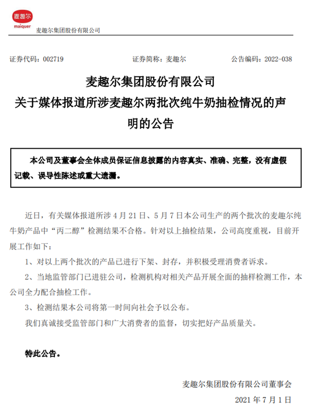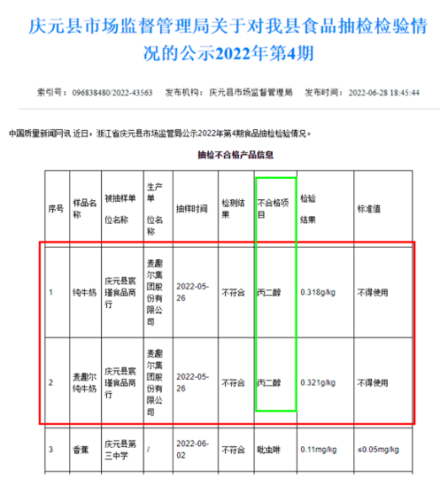 2022年6月28日,浙江省丽水市庆元县市场监督管理局公示了2022年第4期食品抽检检验情况:乳企麦趣尔(SZ002719,股价7.98元,市值13.9亿元),生产的2批次纯牛奶不合格,不合格项目为丙二醇,项目标准值应为“不得使用”(图1)。随后,麦趣尔登上微博热搜,网友纷纷表示“刚喝完两箱,心态崩了”、“塌房了,我最爱的牛奶没有之一”、“好气啊!我还经常给孩子买了喝”…![]()
