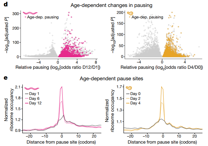 研究者运用核糖体测序(Ribo-seq)等技术手段检测衰老是否会改变秀丽隐杆线虫和芽殖酵母衰老模型的翻译延伸过程。系列结果显示,这两种生物中与年龄相关的翻译起始减少,且核糖体停顿增加。