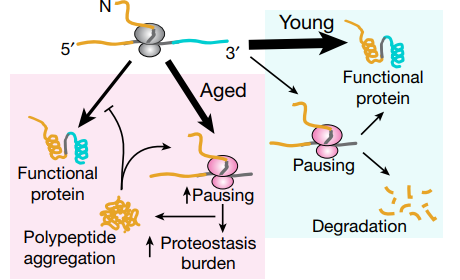 衰老过程中核糖体停顿增加与新生多肽聚集的模型(图源:Nature)