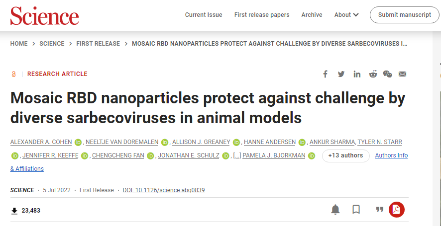2022年7月5日,美国加州理工学院和英国牛津大学合作在顶级期刊Science以“first release”形式发表了一篇题为“Mosaic RBD nanoparticles protect against challenge by diverse sarbecoviruses in animal models”的研究论文。研究团队称正开发一种名为“Mosaic-8”的多功能疫苗,可保护人们免受新冠病毒未来变种、SARS、MERS等冠状病毒新毒株的影响。
