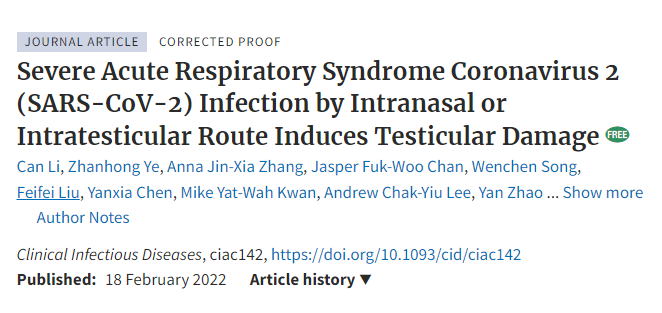 [1]Subramanian A, Nirantharakumar K, Hughes S, et al. Symptoms and risk factors for long COVID in non-hospitalized adults. Nat Med. 2022 Jul 25. doi: 10.1038/s41591-022-01909-w. Epub ahead of print. PMID: 35879616.[2]Li C, Ye Z, Zhang AJ, et al. Severe acute respiratory syndrome coronavirus 2 (SARS-CoV-2) infections by intranasal or testicular inoculation induces testicular damage preventable by vaccination in golden Syrian hamsters. Clin Infect Dis. 2022 Feb 18:ciac142. doi: 10.1093/cid/ciac142. Epub ahead of print. PMID: 35178548; PMCID: PMC8903466.
