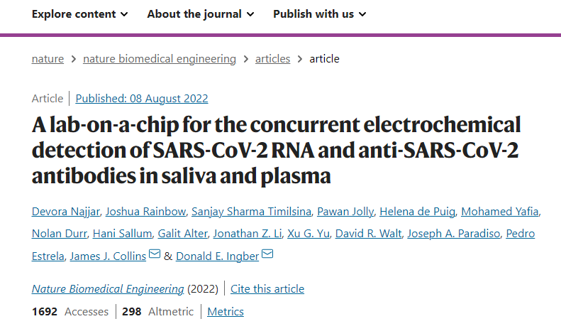 SARS-CoV-2 RNA and anti-SARS-CoV-2 antibodies in saliva and plasma”为题,发表在Nature Biomedical Engineering上。在这项研究中,研究人员开发出一种芯片设备,其可以通过多路电化学输出在2小时内同时检测到人体唾液中的新冠病毒和抗体[1]。
