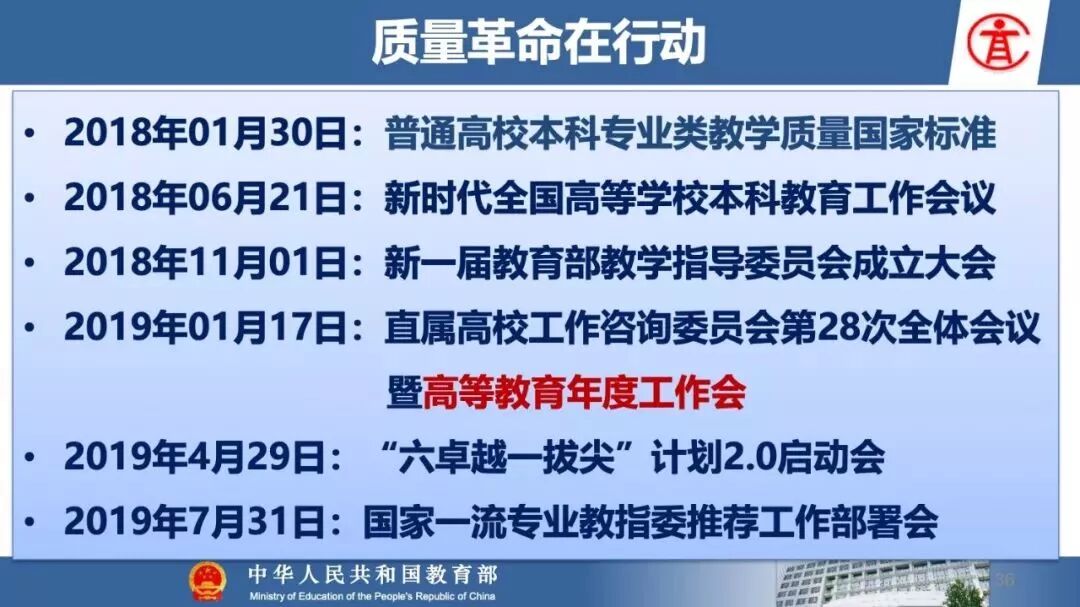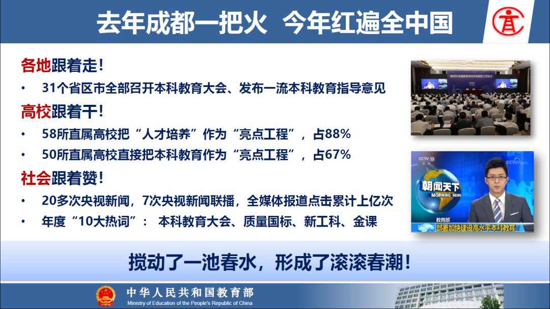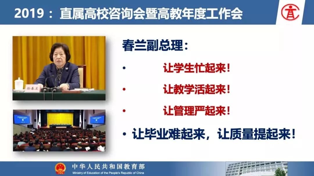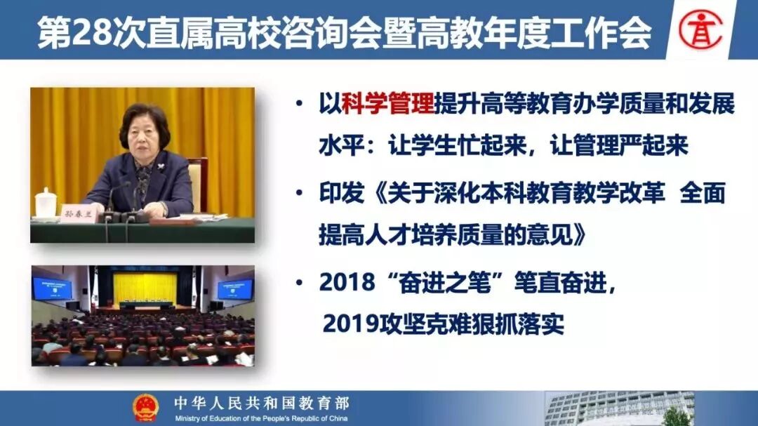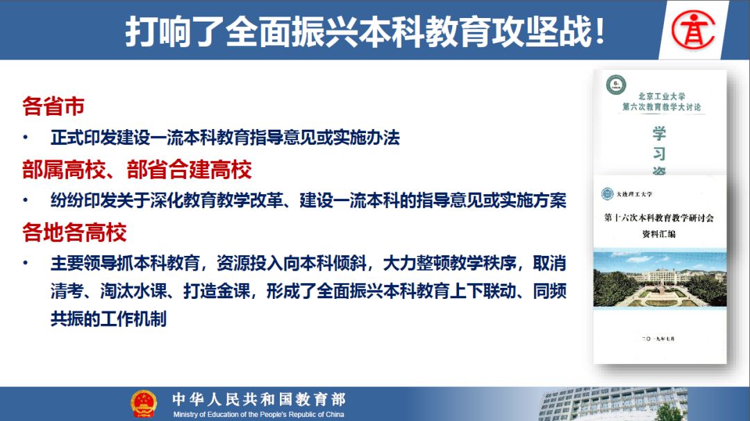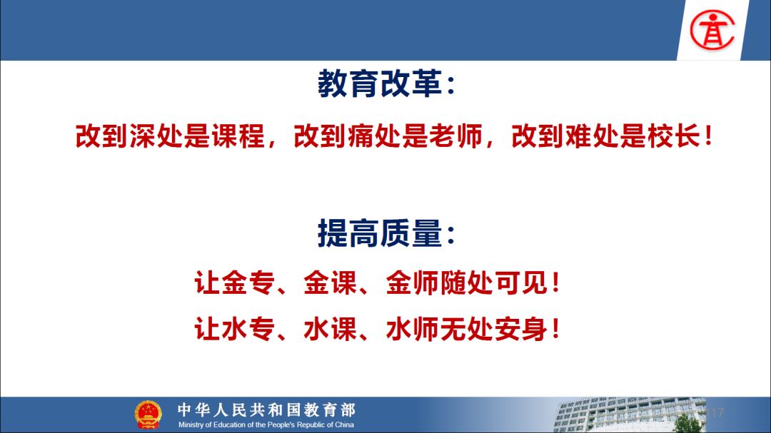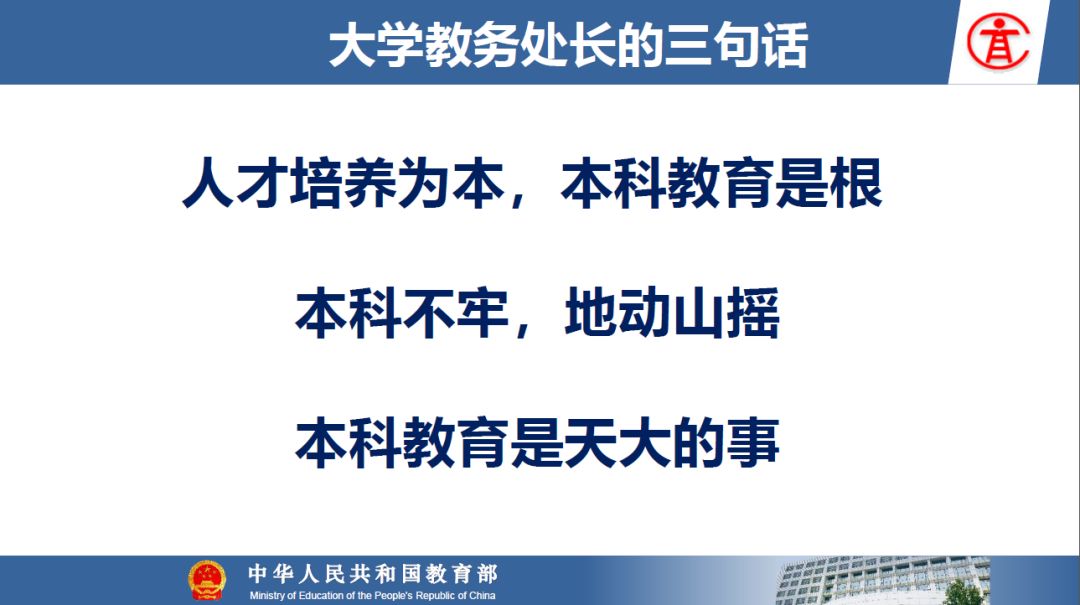 报告指出:要精准把握高等教育发展大势,超前识变、积极应变、主动求变;提到本科教育呈现新局面,“以本为本,四个回归”理念深入人心,“三个不合格、四个首先”得到有效落实;最后强调要通过一系列行动,把本科教育质量实实在在提起来,学校要狠抓教学改革,让金专、金课、金师随处可见!