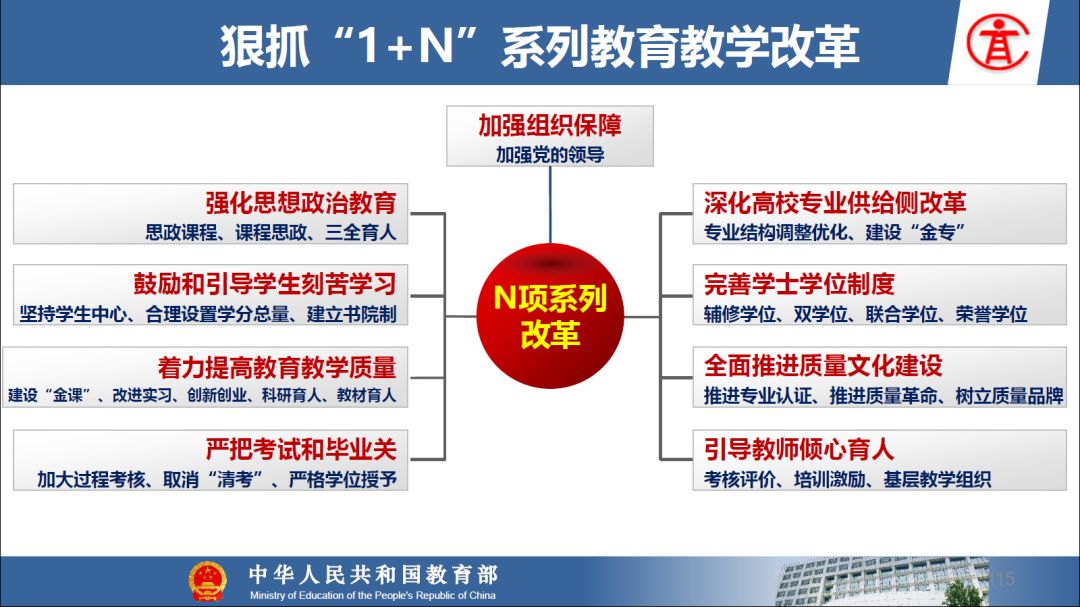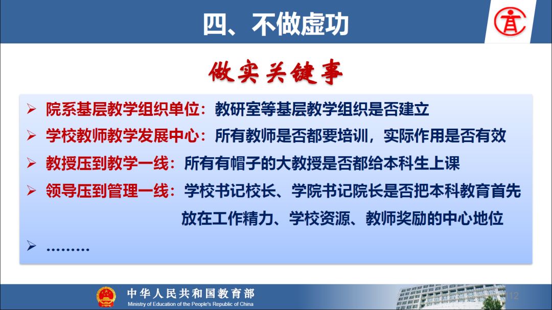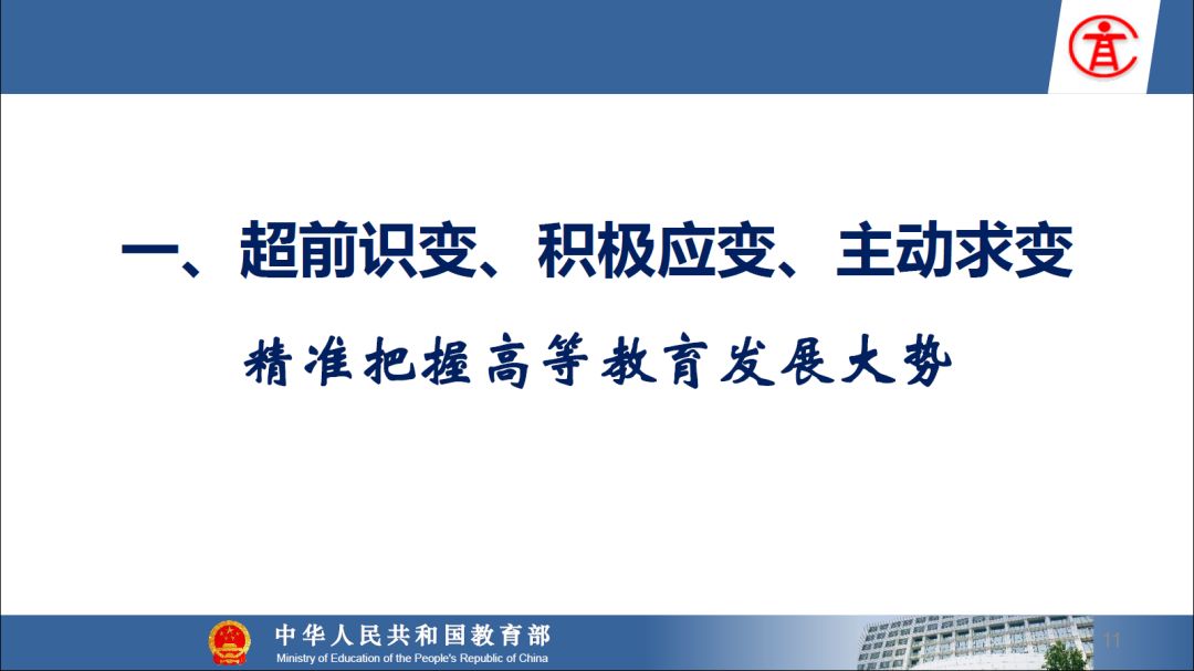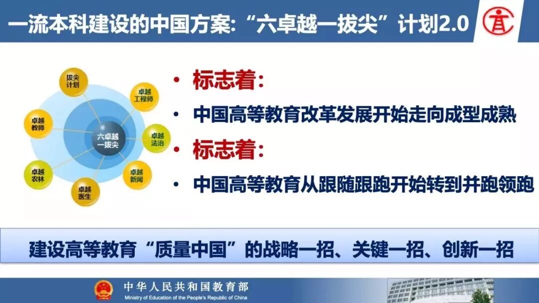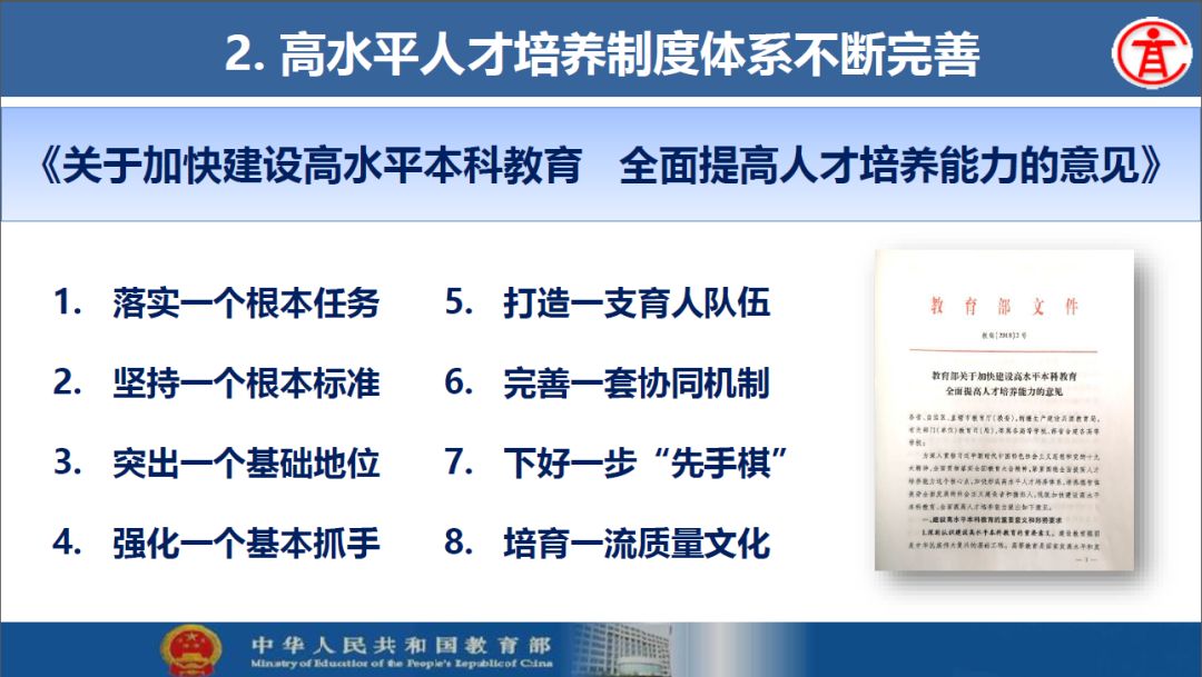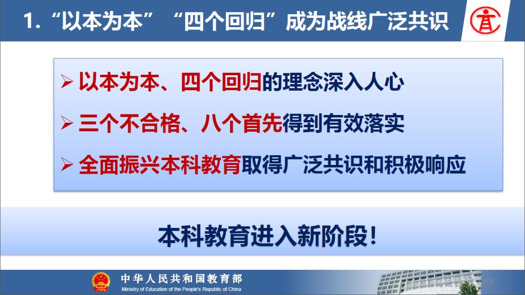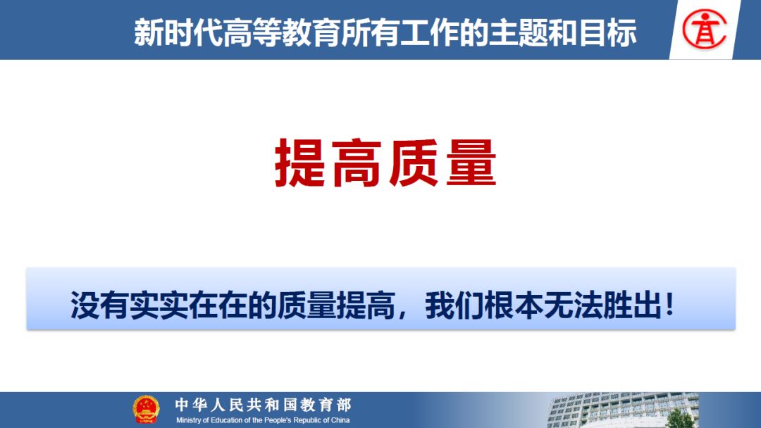报告指出:要精准把握高等教育发展大势,超前识变、积极应变、主动求变;提到本科教育呈现新局面,“以本为本,四个回归”理念深入人心,“三个不合格、四个首先”得到有效落实;最后强调要通过一系列行动,把本科教育质量实实在在提起来,学校要狠抓教学改革,让金专、金课、金师随处可见!