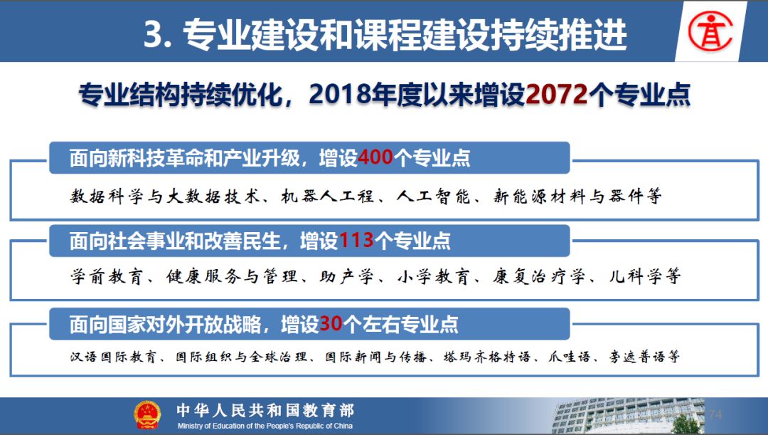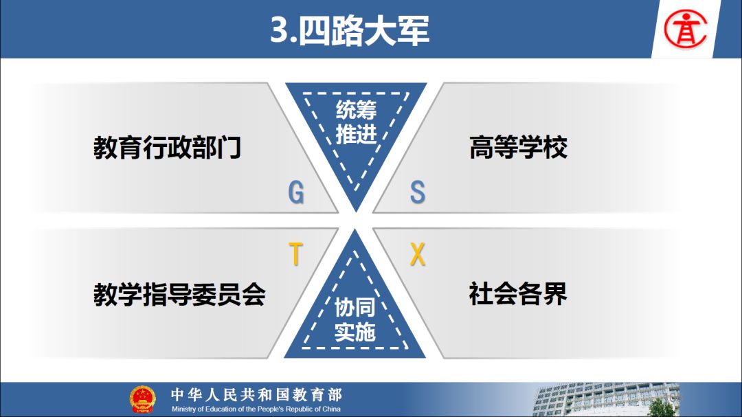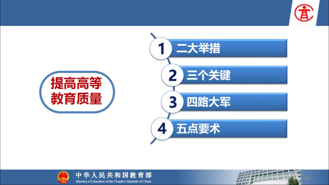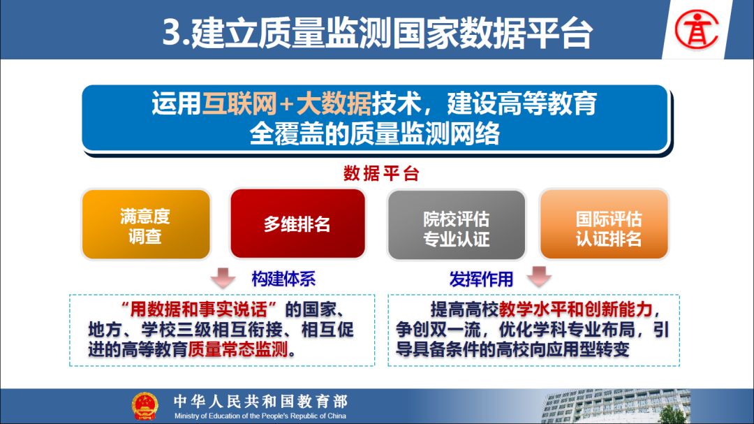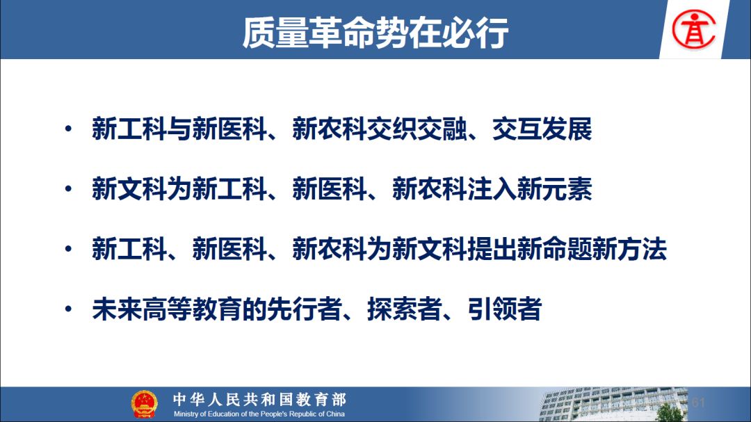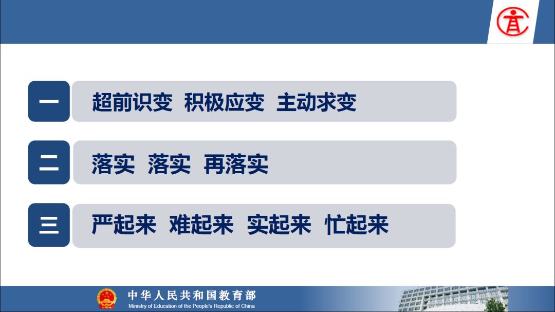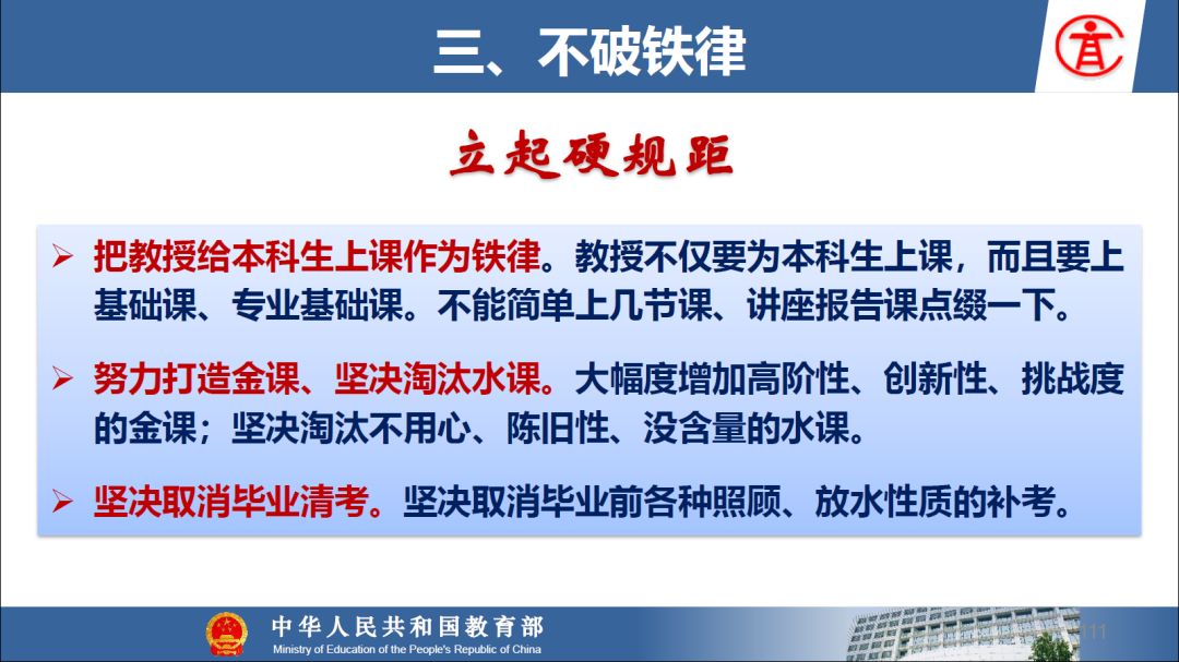 报告指出:要精准把握高等教育发展大势,超前识变、积极应变、主动求变;提到本科教育呈现新局面,“以本为本,四个回归”理念深入人心,“三个不合格、四个首先”得到有效落实;最后强调要通过一系列行动,把本科教育质量实实在在提起来,学校要狠抓教学改革,让金专、金课、金师随处可见!