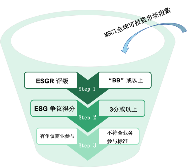 MSCI ESG领先指数的标的从MSCI全球可投资市场指数(GIMI)的组成部分选取。通过指数筛选之前,标的公司首先需要具备MSCI ESG Research提供的公司评级和完整的ESG研究,正式进入筛选流程。