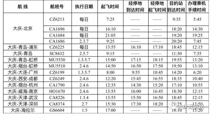 《大庆萨尔图机场又添新航线,航班时刻有调整》3月25日,大庆机场将执行夏秋季航班计划,同时将新添大庆-天津-深圳、大庆-烟台-虹桥两条航线。大庆-天津-深圳航线由中国国际航空公司波音738执行,航班号为CA8373/8374,每周二、日各一班。大庆-烟台-虹桥航线由中国东方航空公司空客320执行,航班号为MU5509/5510,每周二、四、六各一班。经销售系统查询,深圳航线机票尚未开始销售。新航季大庆出港航班在售客票折扣力度较大,均在5折以下。其中:北京3.9折470元,青岛3.2折420元,上海4折760元,烟台3.7折500元,天津3.6折520元,广州4折1040元,大连2.7折300元,成都5折1170元,西安4.2折760元,杭州4.3折860元,武汉4折920元,南京3折640元,威海4.6折620元。