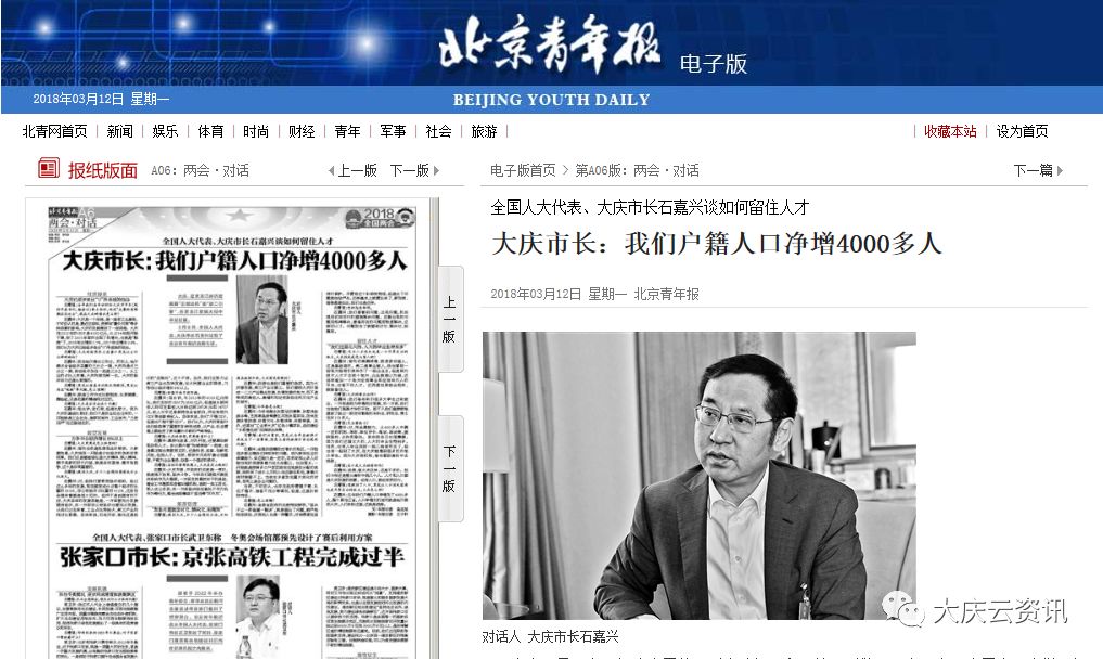《2017年,黑龙江省人口净增长城市只有哈尔滨和大庆》3月8日,全国人大代表、大庆市长石嘉兴接受了北京青年报记者的专访。石嘉兴说:我在哈尔滨也工作过。历史上,哈尔滨占全省经济总量的三分之一强,大庆则是占三分之一弱,其他地市加在一起是三分之一。从工业的占比上来看,大庆则排在第一位。大庆的基础比较好,我们不是农业社会过来的,一开始就是工业社会,是移民城市、工业城市。在谈到大庆如何留住人才时,石嘉兴说:首先得靠待遇、物质条件留人,这是基础层次。第二是事业留人,这两者如果结合起来,就能留住人。石嘉兴说:前不久我们直接破格提拔了经过一段时间锻炼的本科生、研究生、博士生共110多人。从400多人中靠一定的机制、考核、单位评价、笔试、面试等,提到副科、正科和副处。其实我自己也很震撼,因为我们这里北大的、人大的毕业生特别多。石嘉兴说:去年我们户籍人口净增加了4000多人,整个黑龙江省,人口净增长的城市就是哈尔滨和大庆。