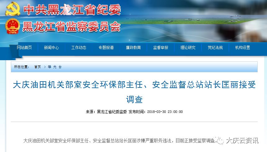 3月30日,省纪委监委网站发布消息:大庆油田机关部室安全环保部主任、安全监督总站站长匡丽涉嫌严重职务违法,目前正接受监察调查。