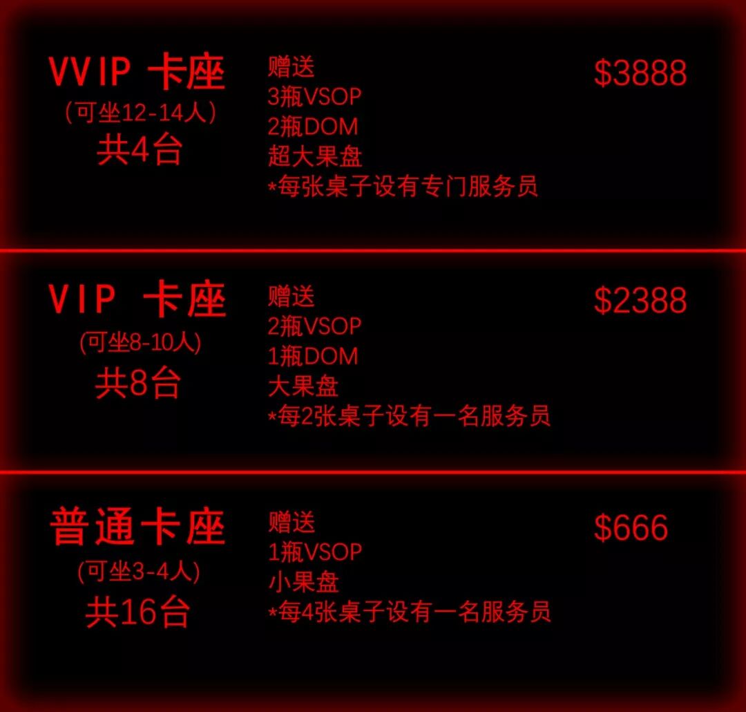 另有$666卡座、$2388VIP卡座、$3888VVIP卡座供各位小主选择!数量有限,手快有,手慢无!