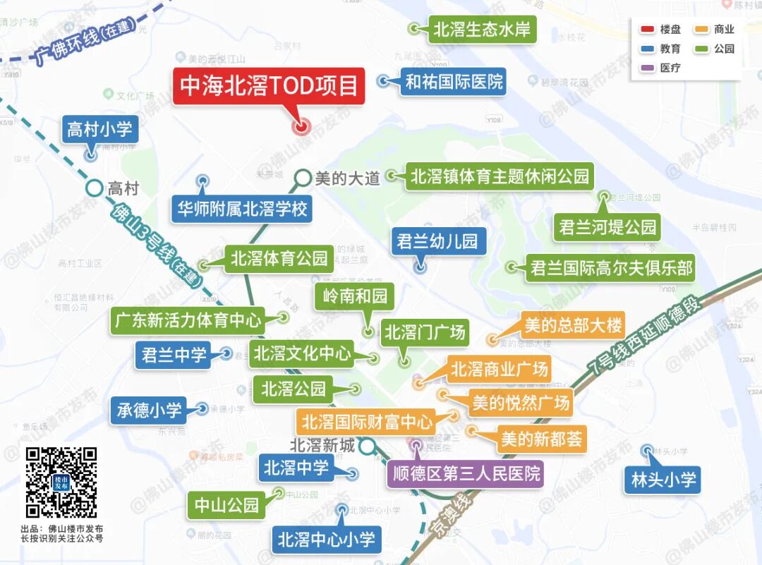 中海北滘TOD项目位于地铁站美的大道站上盖,地属北滘新城板块。去年6月,中海以总价56亿拿下北滘新城TOD地块,折合楼面价18843元/平,一跃成为北滘地价TOP1,位列佛山第六。虽然项目还未正式亮相,但却备受周边竞品项目关注,有销售称中海TOD项目预计首开价会超过3万/平,预计下半年入市。首先,项目位于广州7号线顺德站美的大道旁,妥妥的地铁上盖,地铁便利度上优于其他在售盘。项目所处广佛交界核心区域,距离佛山新城不到10公里,距离超级枢纽广州南站仅13公里,地理位置优越。其次,片区内产业完善,周边有八大总部企业、人才小镇,未来将汇聚众多高端人才;中海TOD项目附近有华师附属北滘学校、和祐国际医院(在建)、北滘公园等,生活配套成熟;