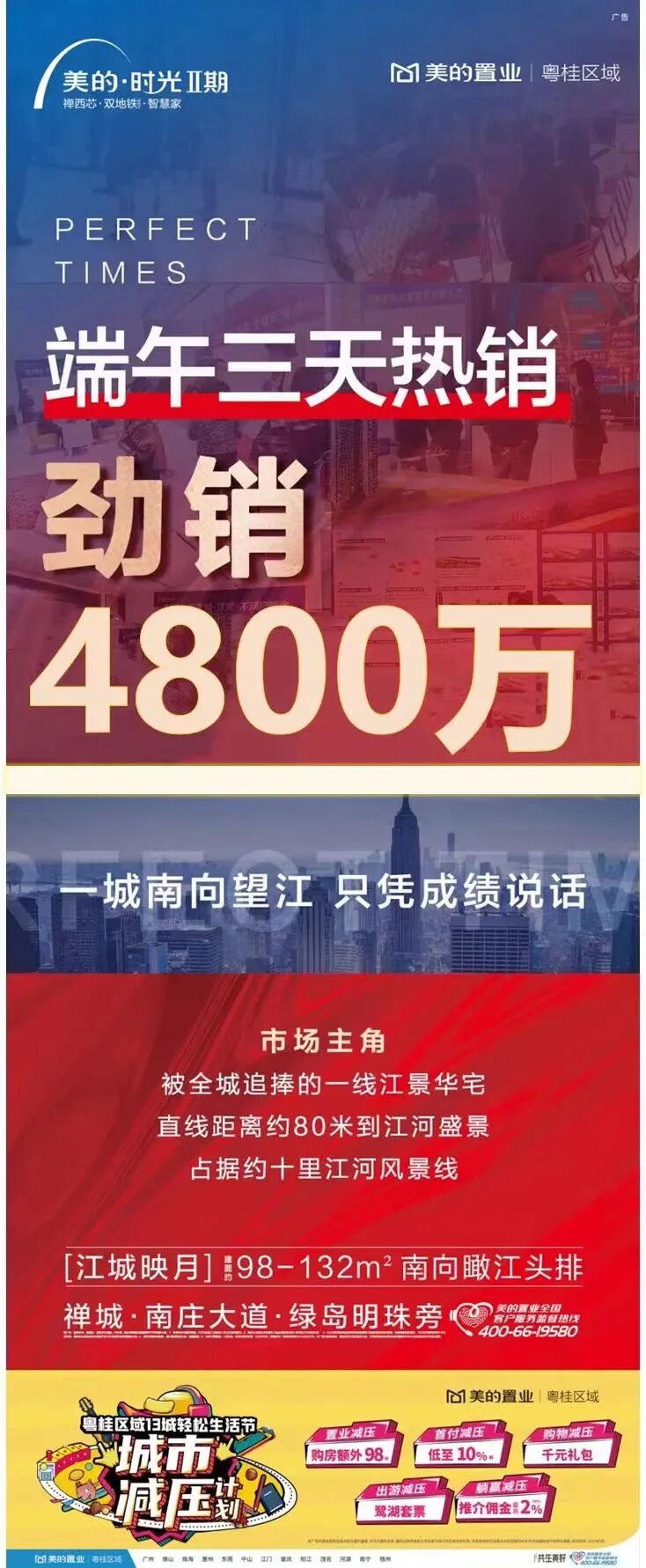 同板块的美的时光成绩也不俗,主推98-132平南向望江单位,三天热销4800万。