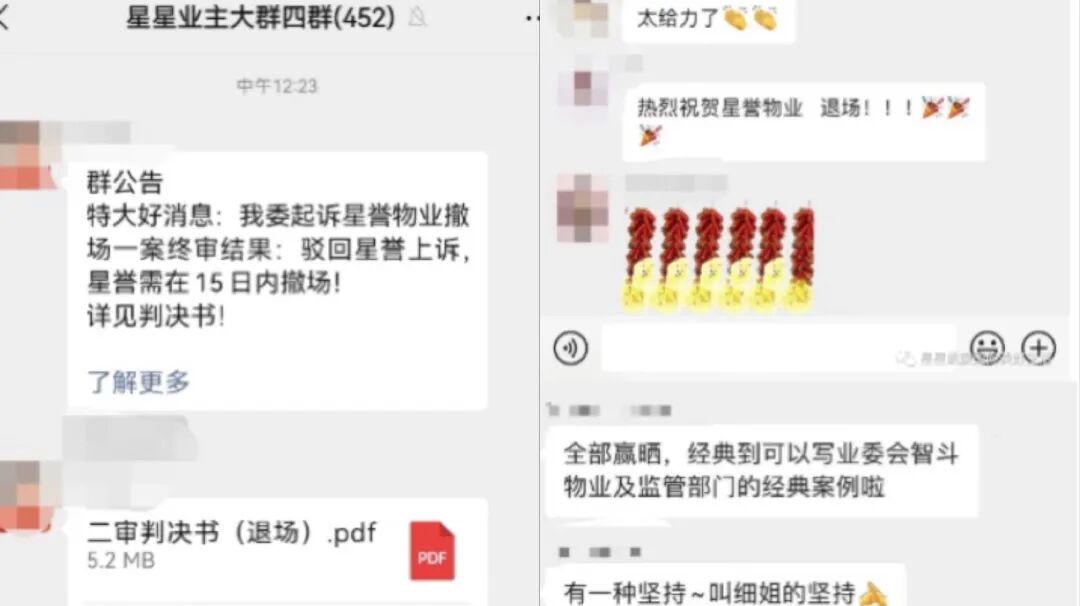 昨晚,星星凯旋国际业主向楼市君发来喜报,称其业委会起诉星誉物业退场一案