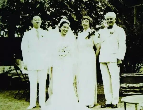 吴健雄(左二)与袁家骝(左一)的婚礼在指导教授、加州理工学院院长密立肯的家中举行,由密立肯夫妇(右一、二)主持