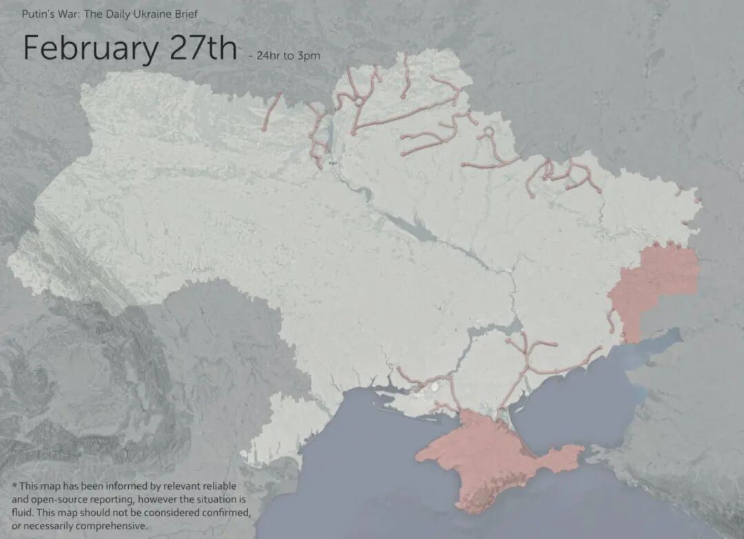 图是芬兰学者贴的,是27号俄乌战争的实况,不是新图,但对于“路网”体现得比较典型。