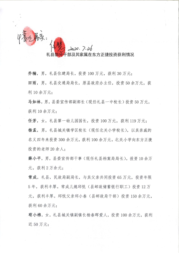 为此,任慧还专门列举一封名为《礼县部分干部及其家属在东方正捷投资获利情况》名录,详细的记录了近20名科级以上干部及其家属投资获利情况。包括礼县住建局局长乔楠、礼县交通局局长田雨、礼县一中校长马如林等多名在职领导干部,投资金额百万到上千万不等,获利数十万到数百万。从名录可以看出,短短数年内,当地诸多坐镇要害领导岗位的公职人员,通过这家小贷公司运行,实现了利益。
