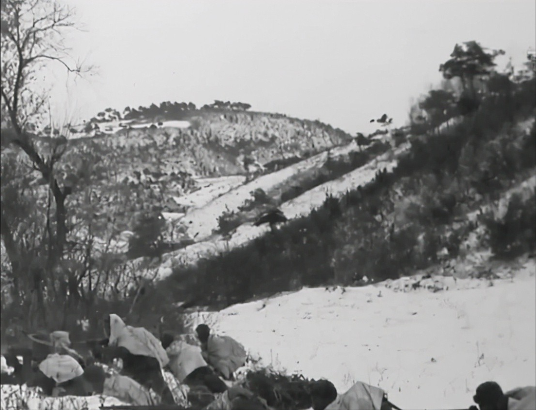 在水门桥附近的高地上,志愿军一个连的官兵呈战斗队形散开,卧倒在雪地里,人人都是手执武器的姿态注视着前方,没有一个人向后,全部冻死在山头上,全部化作了晶莹的冰雕。