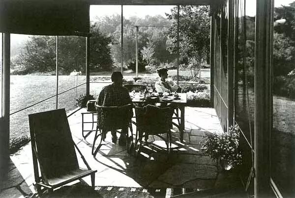 格罗皮乌斯与妻子在自宅玻璃景廊里用餐