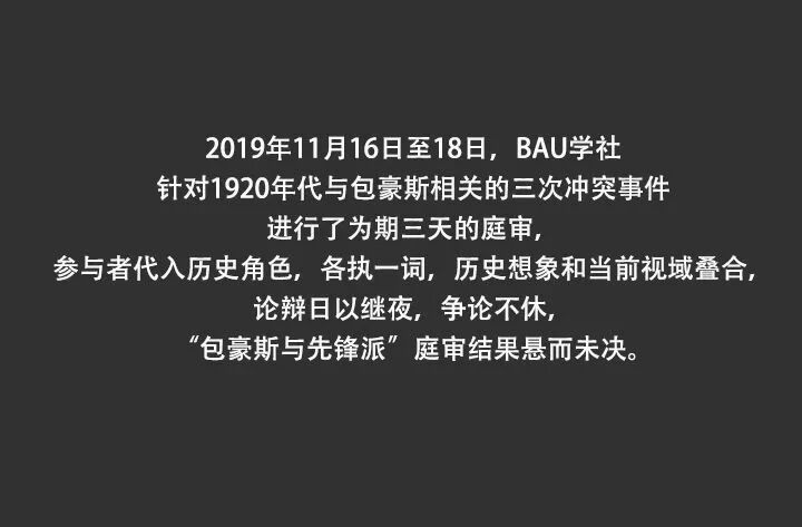 学社|它是一个始终流动的师生研习群体,聚焦于现代性条件下的包豪斯,并逐步拓展到先锋派的历史,包括理论上的先锋派和实践上的先锋派。BAU学社作为名称第一次出现在2014年,除了几位创办人之外,无固定人数,无固定成员,这个群体的轮廓和面貌会随着每次情境和事件的不同有所变化。学社以包豪斯的组织方式与理念来研究包豪斯与先锋派,强调相互论争和共同议题同等重要,历史重构和日常实践同等重要;学社主张以具体的做与作,让自己和前人的“真实激情”相遇。