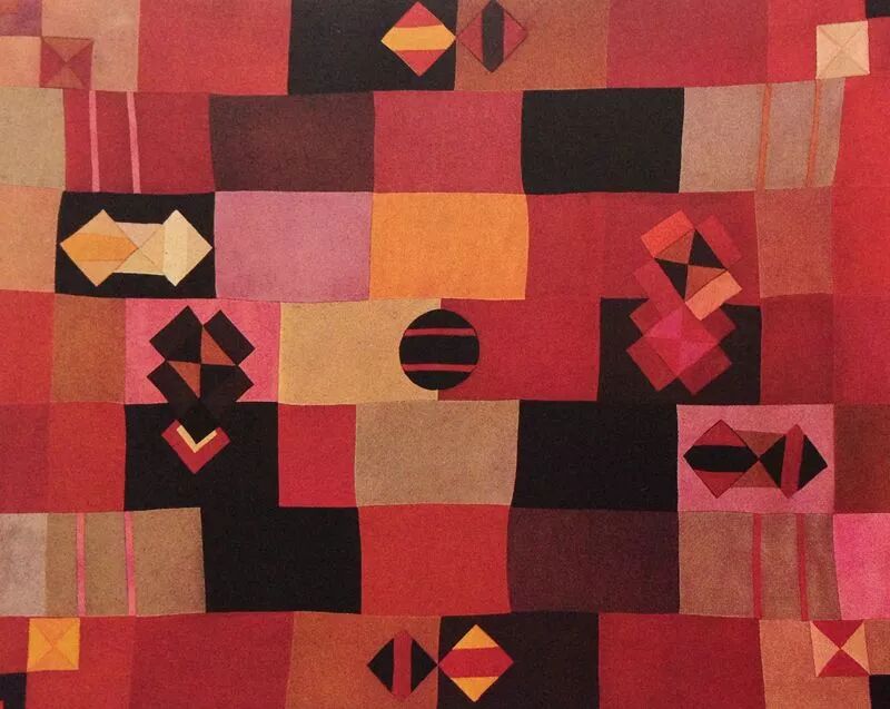 伊达的另一件纺织品杰作是由大红色调主导的,用机器缝制的毛毡贴布作品。基本的几何图形涂鸦式的散落在画面中,其中一些巧妙地环环相扣。这件作品经测量,长为6¾英尺(2.1米),宽为5¼英尺(1.6米)。原本打算将该作品当作床罩,但它被汉娜·贝克尔·冯·露丝用作壁挂。显然,伊达已经尝试了包豪斯提供的所有纺织技术。正因如此,一组通称为提花面料的织物也留存了下来:这种织物的生产过程非常复杂且需要高强度的劳作,仅存在于1922年之前魏玛纺织品的少数样本中。