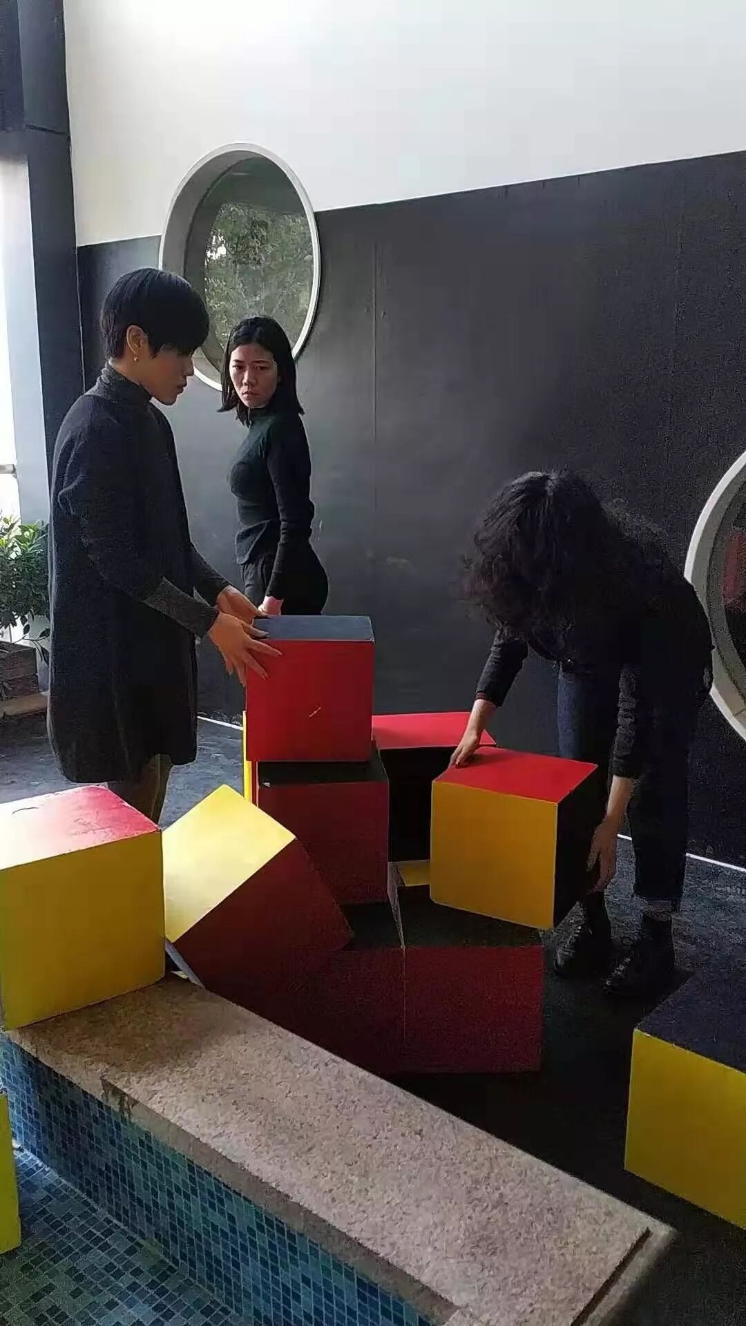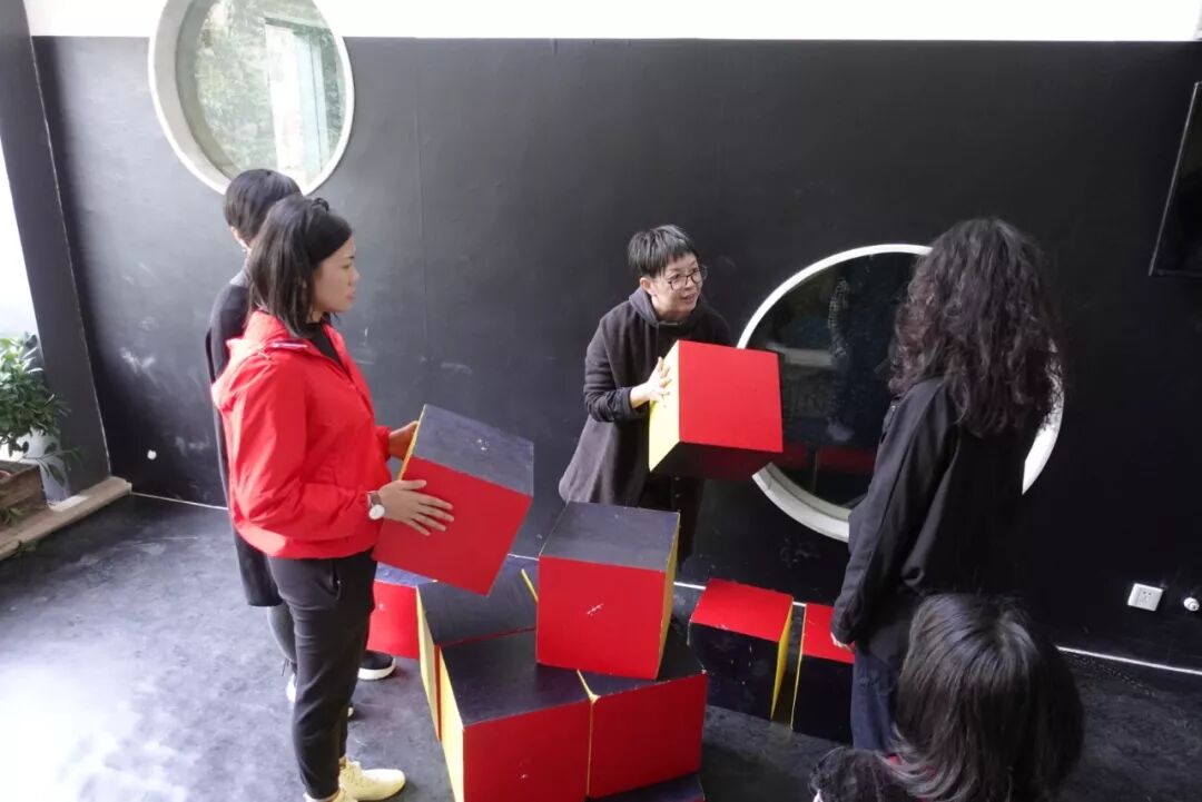 地点:二楼门厅小舞台 [左侧] 竖屏展示研究者对包豪斯诸多对抗性关系的历史重演,时长1小时10分。[右侧] 竖屏录播BAU学社成员针对“包豪斯与先锋派”进行的一场为时三天的线上庭审,时长1小时10分。[中间] 横屏直播开幕式当天在这幢建筑中发生的一次特殊穿行,将幕一与幕二、三链接。时长约半小时。 负一楼展厅|第二幕|最后一个人文主义者 the last humanist 开幕式当天,一人一狗在这幢建筑中发生的一次特殊穿行。亿达大厦路线:负一楼展厅——地面无界的墙——二楼“包豪斯梯台”——乘电梯至十六楼办公区—— 上至屋顶花园——十四楼“物阵-球”——十二楼“物阵-线”——四楼“物阵-块”地面无界的墙|二楼“包豪斯梯台”| 屋顶花园|第三幕|物阵formative things 最低介入,以球、线、块,转换三个空中花园的形态和逻辑,激发行为。地点:亿达大厦十四楼“物阵-球”、十二楼“物阵-线、四楼“物阵-块”。物阵-球|物阵-块|