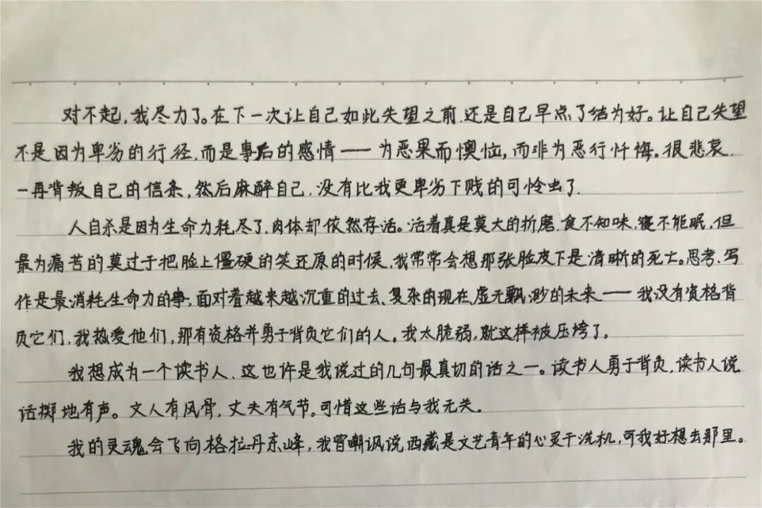 然而徐誉舒向来标榜要考北大,无论是对家人还是同学,甚至对自己也是这样要求的。在高中的一篇随笔中,他这样写道:“有些自大地讲,考一所国内一流的顶尖大学是毫无问题的,甚至如果我认真学习,有冲击清北的可能性,况且北大中文系的录取通知书是我对另一个人的承诺。”