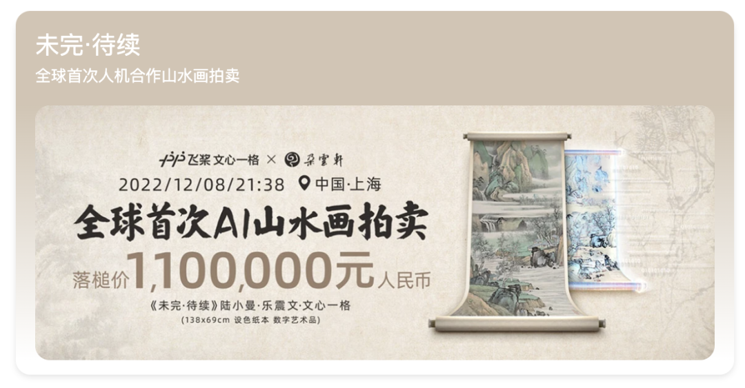 百度推出了AI艺术和创意辅助平台文心一格。在2022年7月举办的百度世界大会上,百度用AI复原了中国十大传世名画之一《富春山居图》的残卷。12月8日,百度联同海派画家乐震文补全的AI画作《未完·待续》,拍出了110万元人民币的高价。