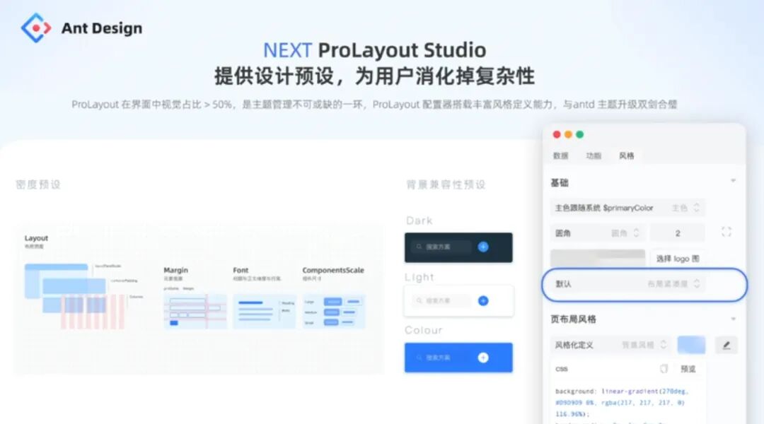 ProLayout(高级页面布局)组件在页面设计中很常用,AntD 5.0 将这个组件和 Design Token 的配置能力相结合,将组件中的所有变量全部开放出来,比如行间距、组件高度等变量设置,做成“紧凑型”、“宽松型”等设计预设解决方案,并支持使用者做小范围定制修改。这些预设方案来源于设计规范和算法的结合。使用预设方案,设计师就不用自己去做大量的设计尝试、配置和寻找页面布局的最优解了: