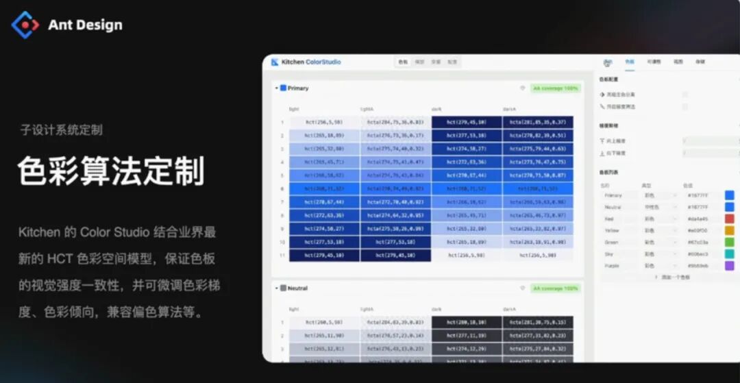 结合 Google 在业界提出的 HCT 色彩空间,AntD 也正在内测 Color Studio,使用色彩算法定制功能,使用户在更换主题色时,能够让页面元素保持正确的视觉层级效果: