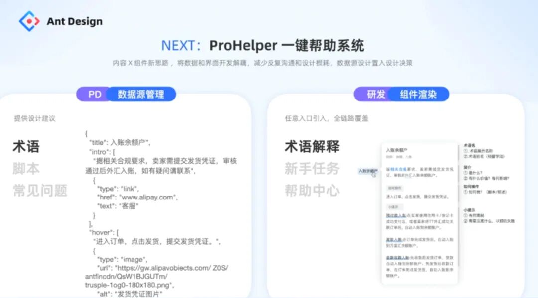 而 ProHelper 帮助系统,则是针对产品帮助系统中的不同数据类型和内容提供组件渲染能力。产品经理可以直接在 ProHelper 中编辑帮助系统的功能排布和内容文案,并管理数据源,帮助系统就可以直接被渲染出来,所写即所得。除了提供简单、基础的设计指导建议,设计师和开发在整个帮助系统的产研工作中不需要再有更多参与: