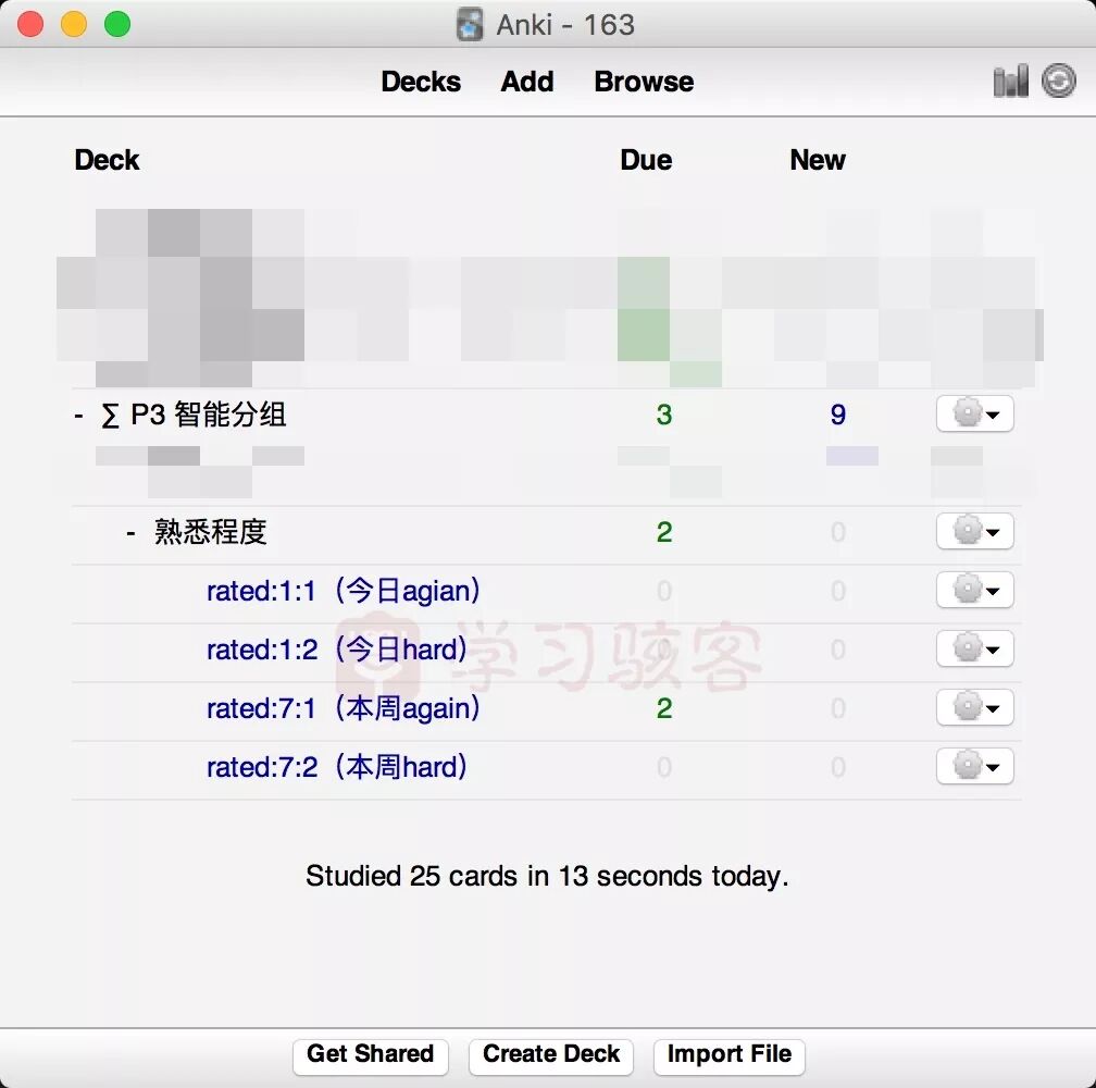 如果你在完成了今天的任务之后,还有很多时间可以继续学习,想找出这一周来点过hard的卡片,可以搜索“rated:7:2”,这前面的7就表示最近7天,后面的2表示熟悉程度是hard的卡片。