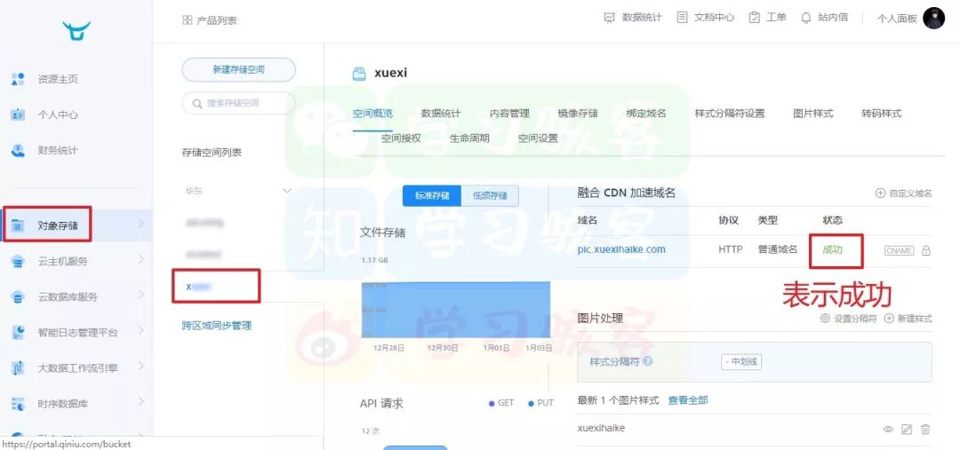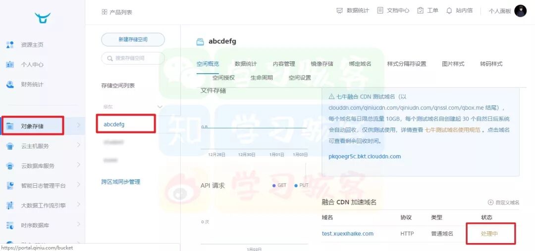 回到“对象存储”,看到右下角“处理中”,则表示需要等待系统刷新。