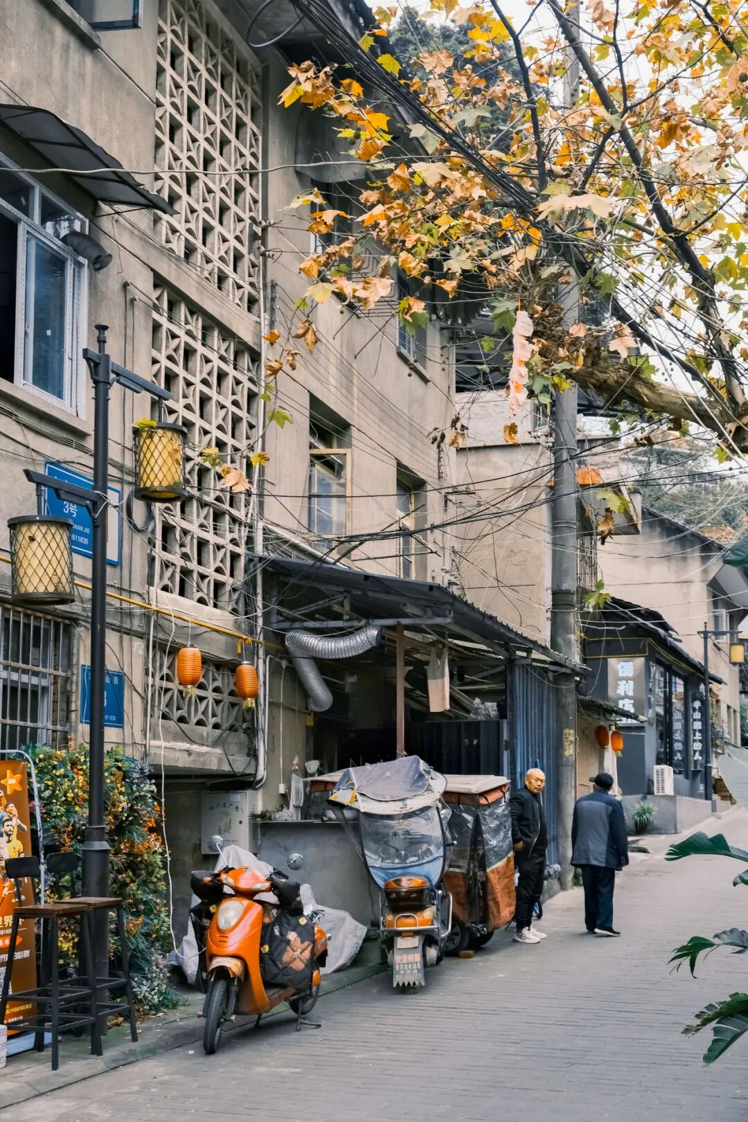 接着就是橙黄的梧桐长廊,树叶铺满屋檐,充满着市井气息的摊贩立于路边,鲜活的老街氛围重现眼前。
