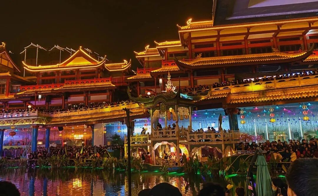 离成都最近的眉山有啥子好耍的?可能很多耍家都还不晓得哈!要说眉山最值得打卡的景点,眉山东坡岛水街肯定是当仁不让。这里被誉为四川的“大唐不夜城”,亭台楼阁间尽是灯火辉煌,配上古风音乐,让人瞬间穿越千年。最火的金府穿越盛世水街,一条河道串起两层高的仿古建筑,中间穿插着亭台楼阁,白玉拱桥,眉山的千年古韵都被唤醒了。除了看夜景,这里也是休闲娱乐的好地方。水街的古建筑里入驻了很多商铺,茶馆、采耳休闲馆、民族餐厅、日料店、咖啡、火锅、音乐餐厅……在这逛一天还是很惬意!出行tips