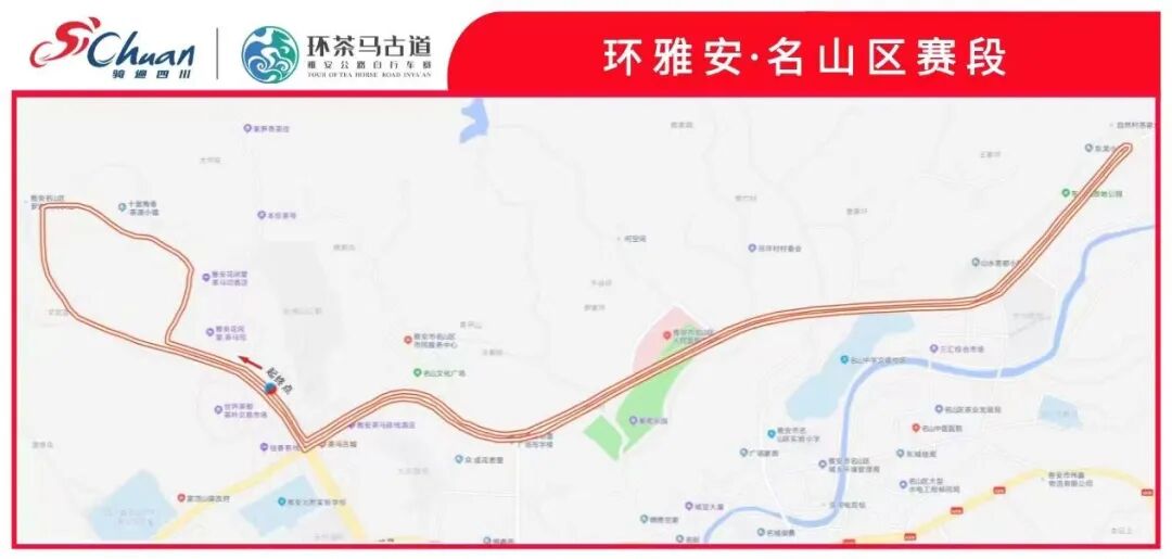 作为比赛的第二段,名山赛区规划路线单圈11KM,骑行10圈,共计110KM。从蒙顶山底小广场出发,蒙顶山茶史博物馆,绕行十里梅香·茶源小圳,再到蒙顶山大道、皇茶大道,到东龙山公园折返,再从皇茶大道,蒙顶山大道绕回蒙顶山底小广场。