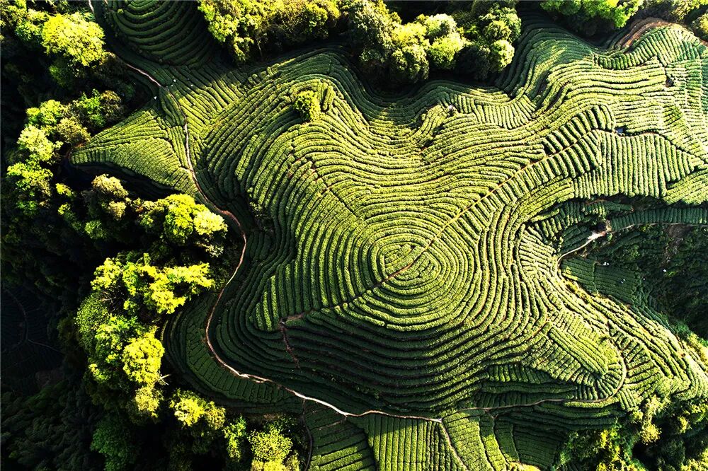 不同于阶梯状的层层递进,这里的茶树依山势呈环状种植,从高空俯瞰,就像一个手指螺纹。![]()